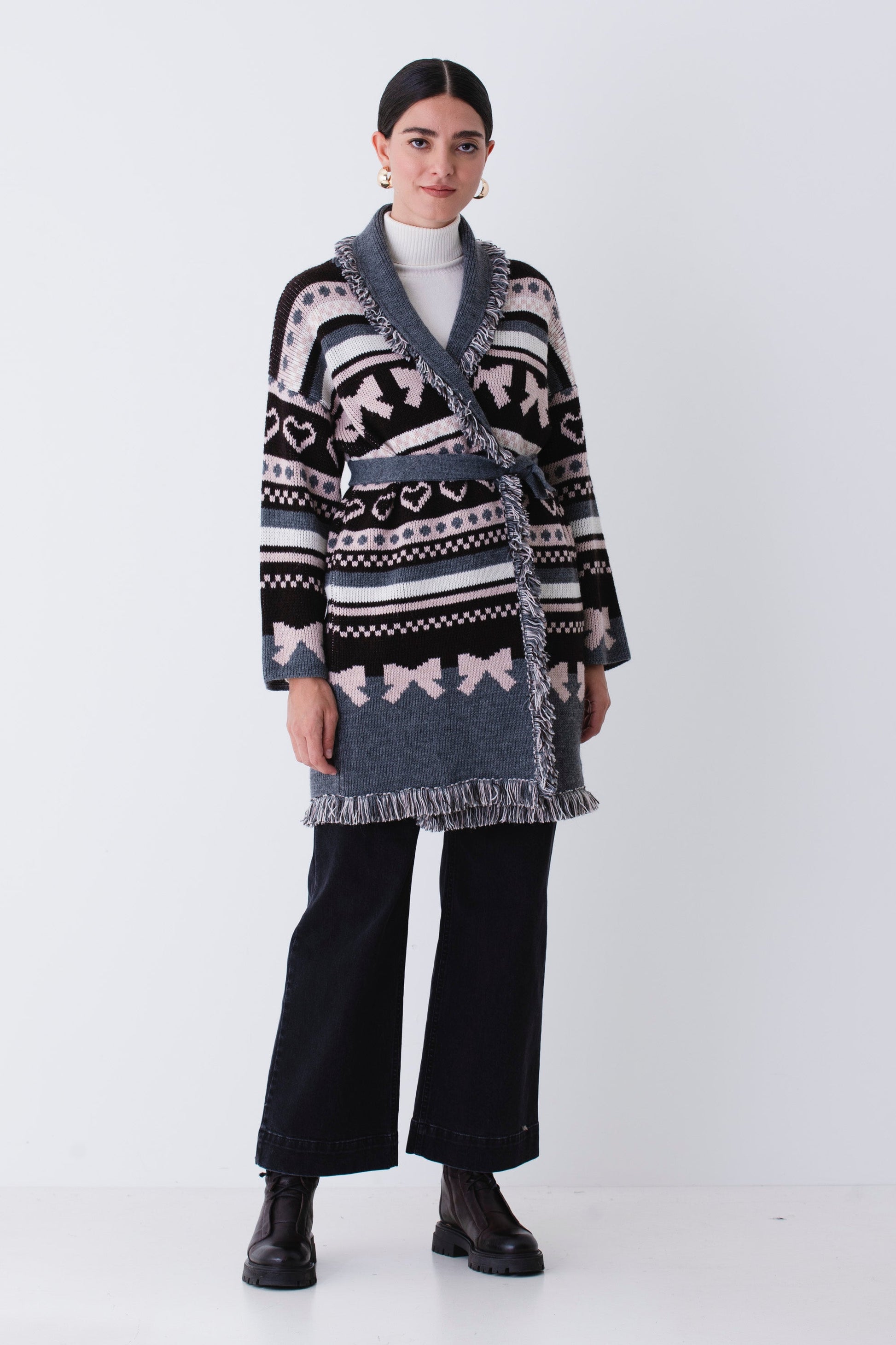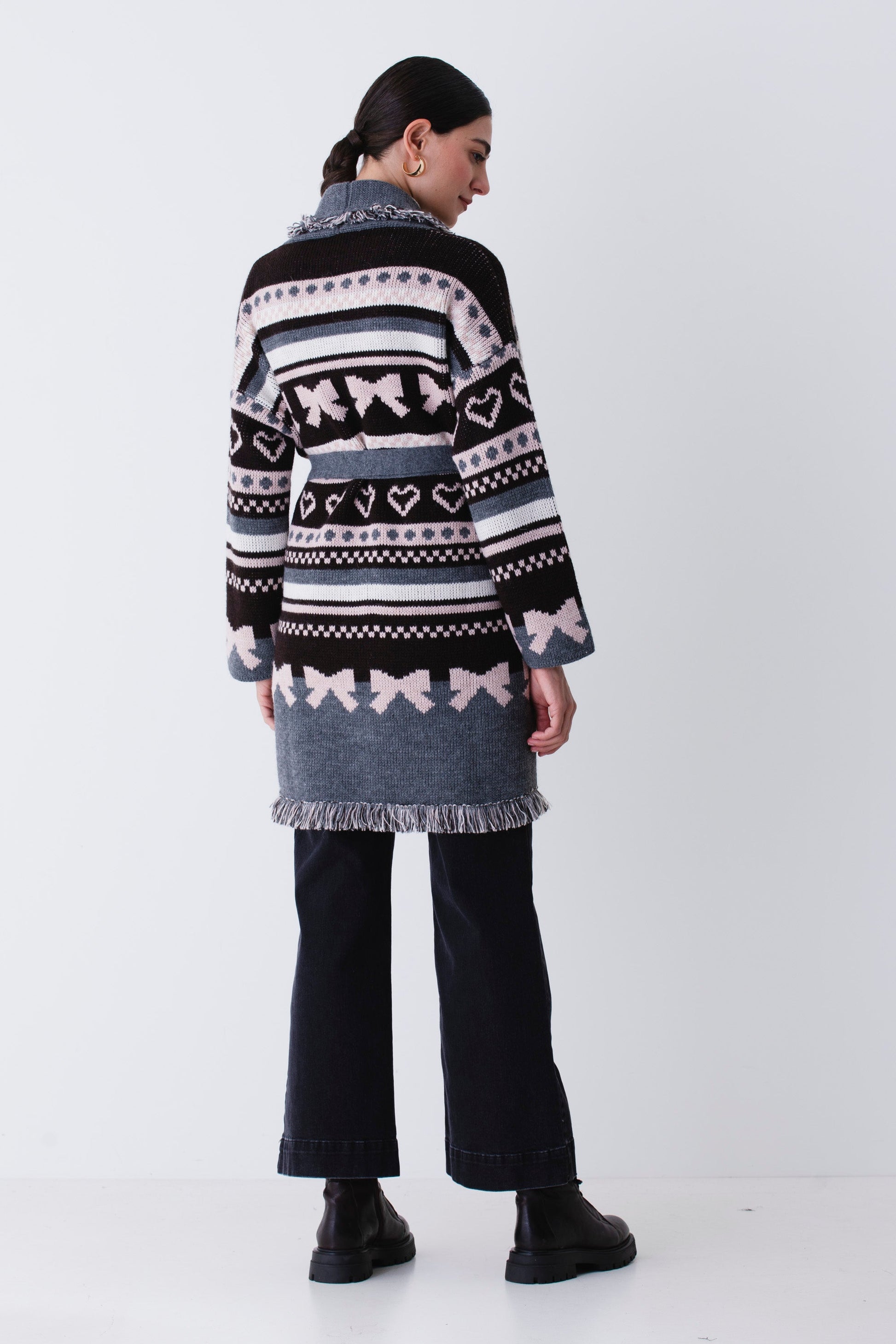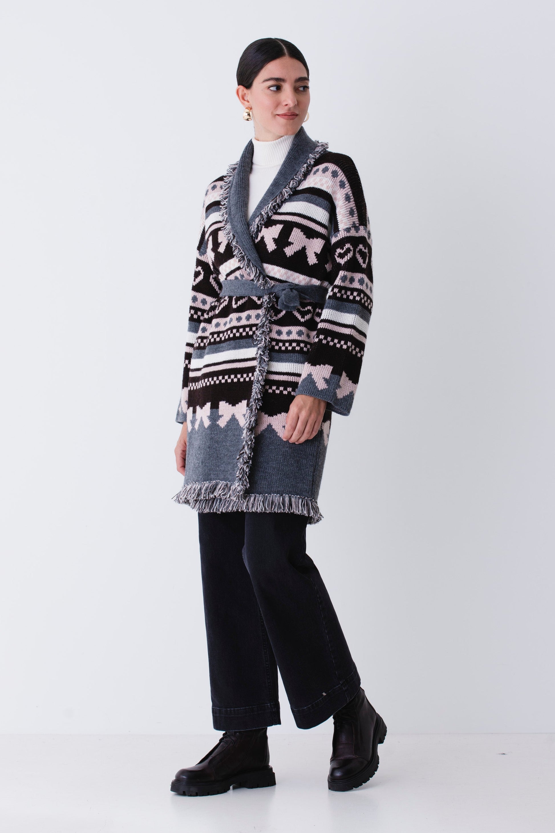 Romántico, cálido y con encanto italiano. Este cárdigan largo en mezcla de lana destaca por sus detalles de corazones y lazos, aportando un toque dulce y cómodo a tu outfit.
