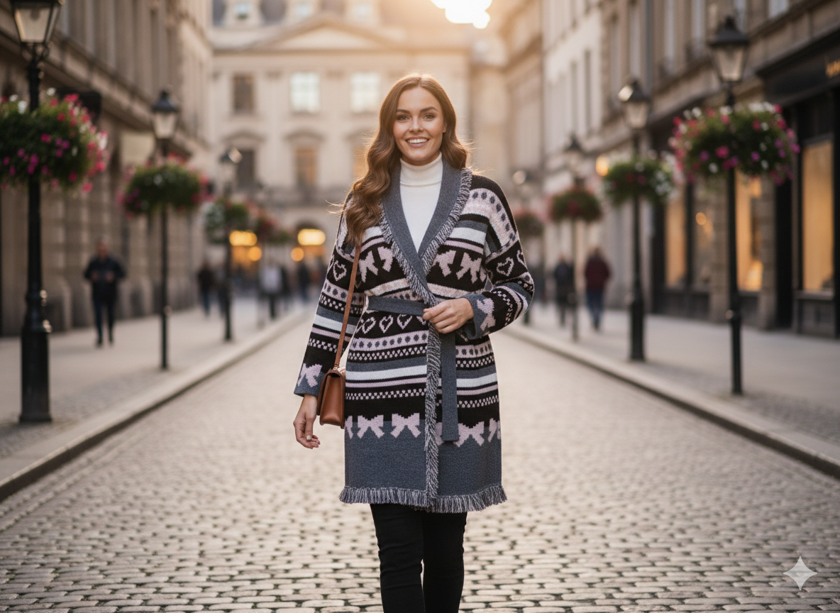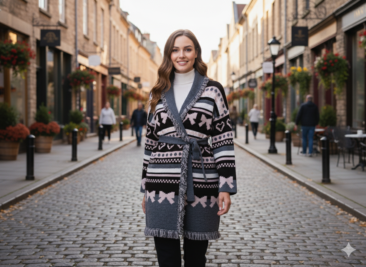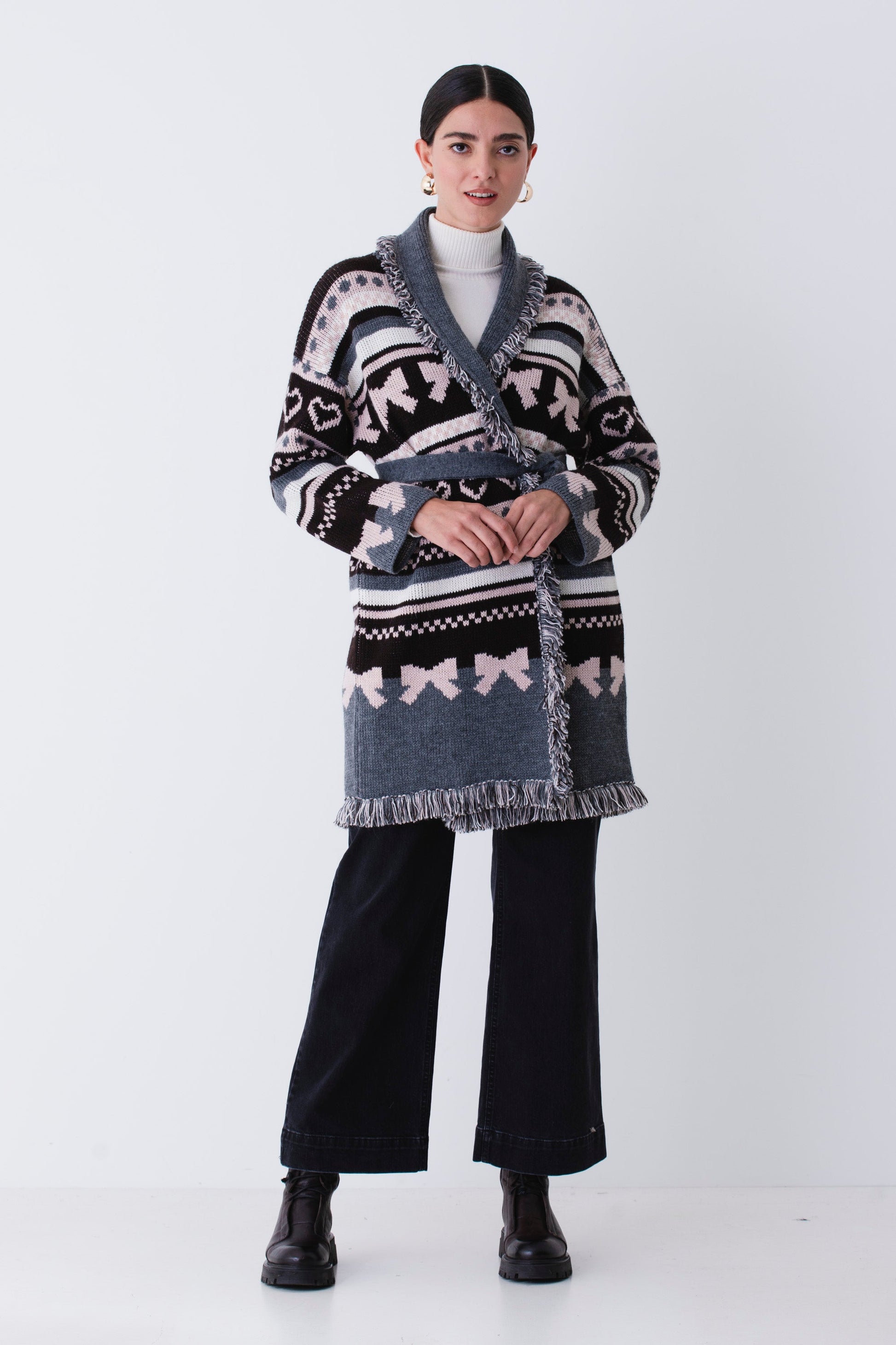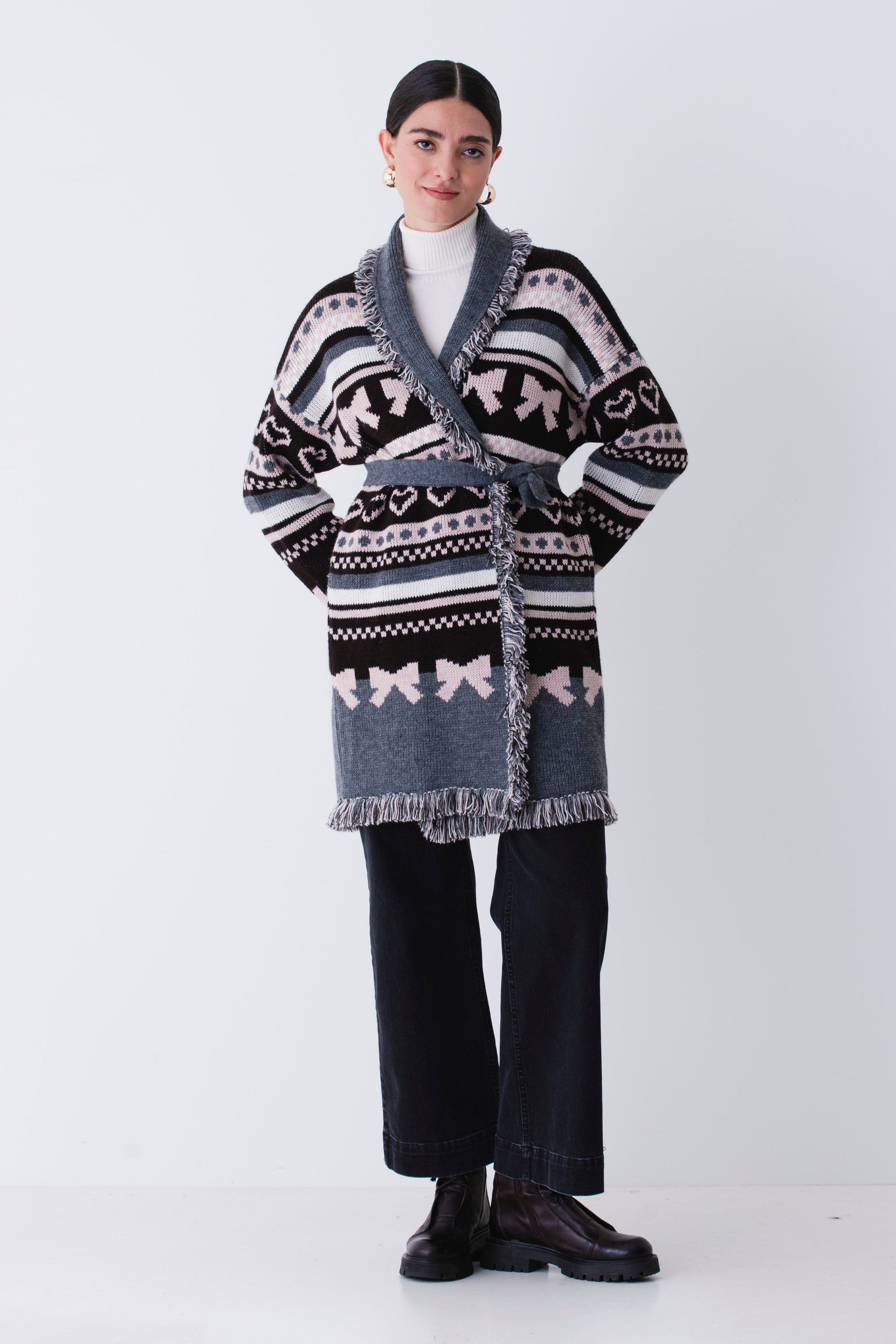 Romántico, cálido y con encanto italiano. Este cárdigan largo en mezcla de lana destaca por sus detalles de corazones y lazos, aportando un toque dulce y cómodo a tu outfit.